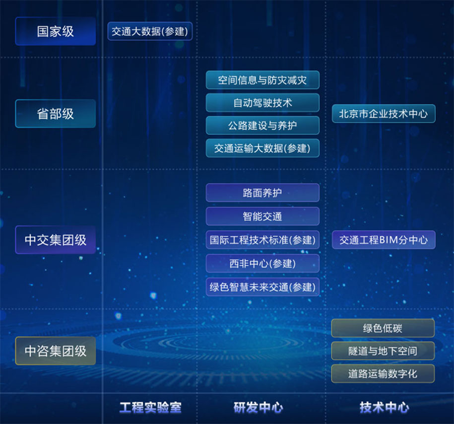 中咨集團(tuán)一直秉承“追求卓越、敢為人先”的創(chuàng)新精神,深入實(shí)施創(chuàng)新驅(qū)動(dòng)發(fā)展戰(zhàn)略,積極開(kāi)展交通強(qiáng)國(guó)試點(diǎn)任務(wù)、科改示范行動(dòng)。承建了空間信息應(yīng)用、智能交通、智慧養(yǎng)護(hù)方向的交通運(yùn)輸部行業(yè)研發(fā)中心,6個(gè)中交集團(tuán)研發(fā)中心,自主成立3個(gè)中咨級(jí)專業(yè)技術(shù)中心,打造“四級(jí)三類”科技創(chuàng)新平臺(tái)體系。致力于成為中咨科技戰(zhàn)略的謀劃者、技術(shù)路線的設(shè)計(jì)者、技術(shù)開(kāi)發(fā)的組織者和市場(chǎng)開(kāi)拓的助力者,賦能公司九元業(yè)務(wù)板塊。